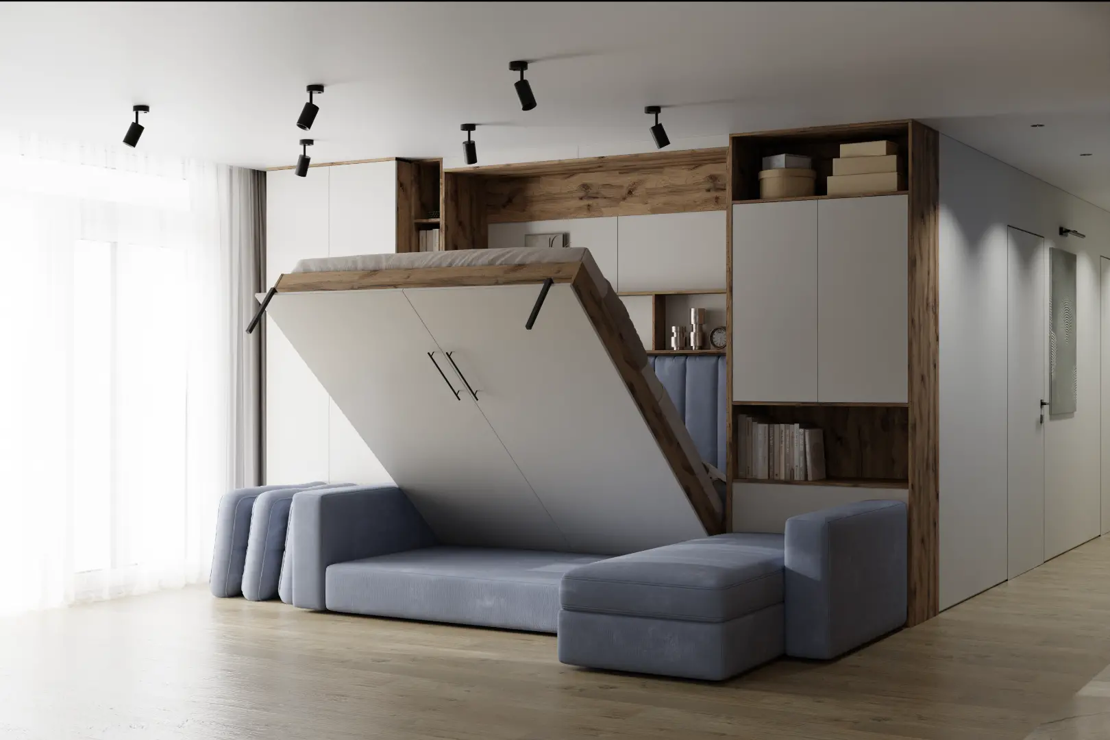 Сделаем шкаф‑кровать под вашу комнату: размеры, фасады и цвет, наполнение (полки/шкафы/антресоли). Учтём ниши, плинтус, розетки и выступы — чтобы всё встало точно и выглядело как встроенное.